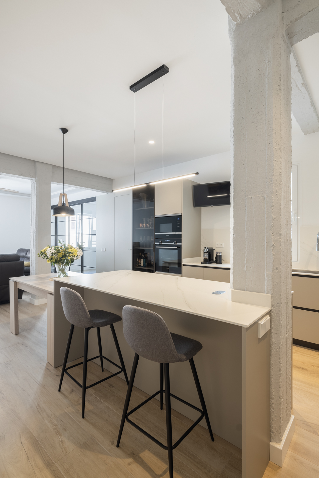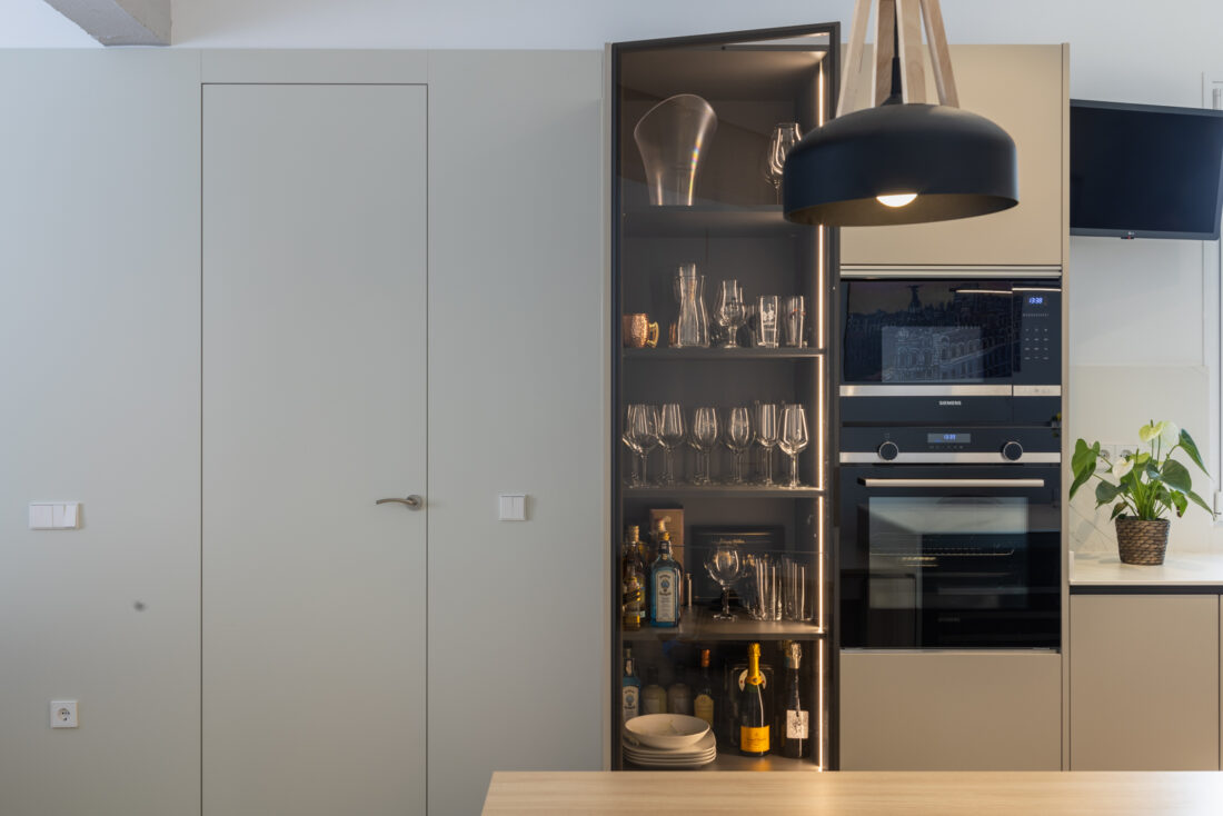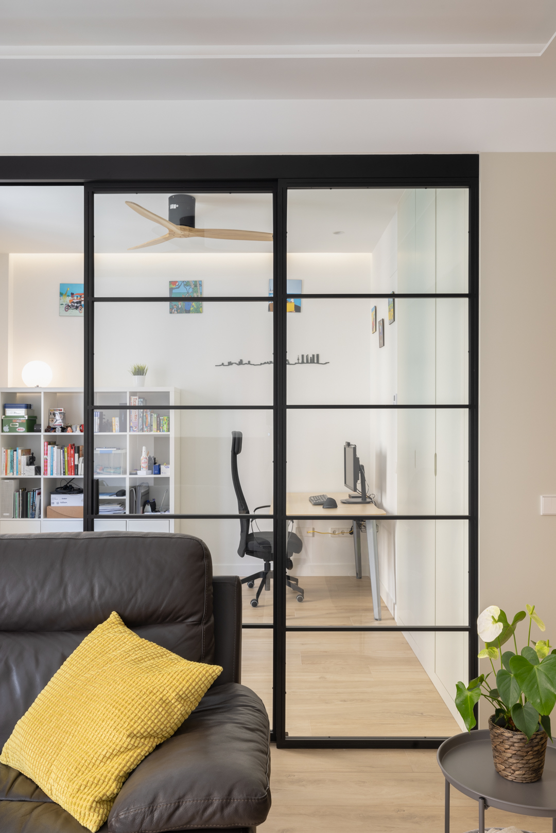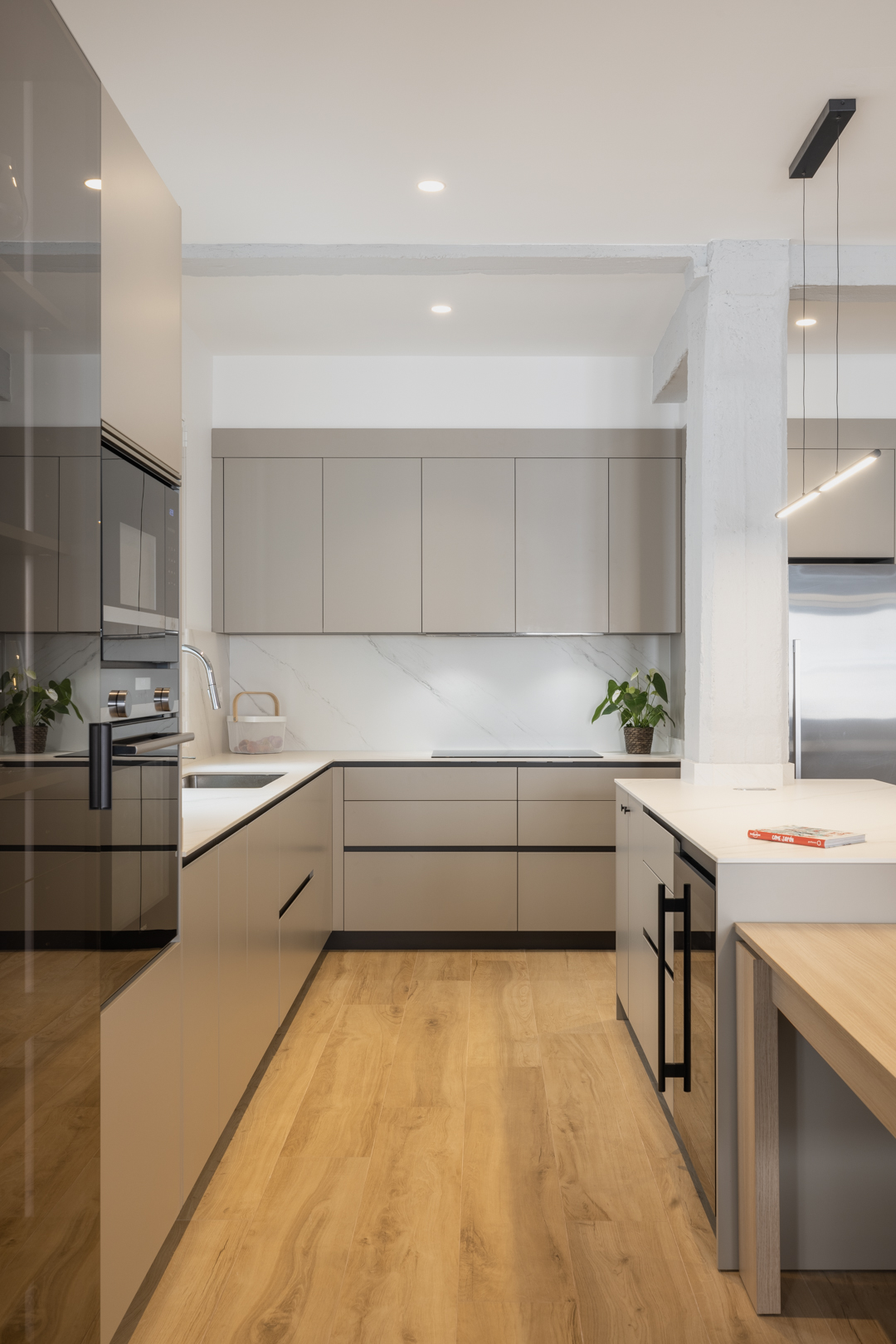 Proyecto de reforma de apartamento en Retiro. La cocina como elemento central del proyecto articula los espacios de la vivienda. El panelado gris de los muebles se extiende por las paredes del pasillo generando continuidad mientras que los espacios de salón y despacho se pueden unir a través de unas puertas correderas.