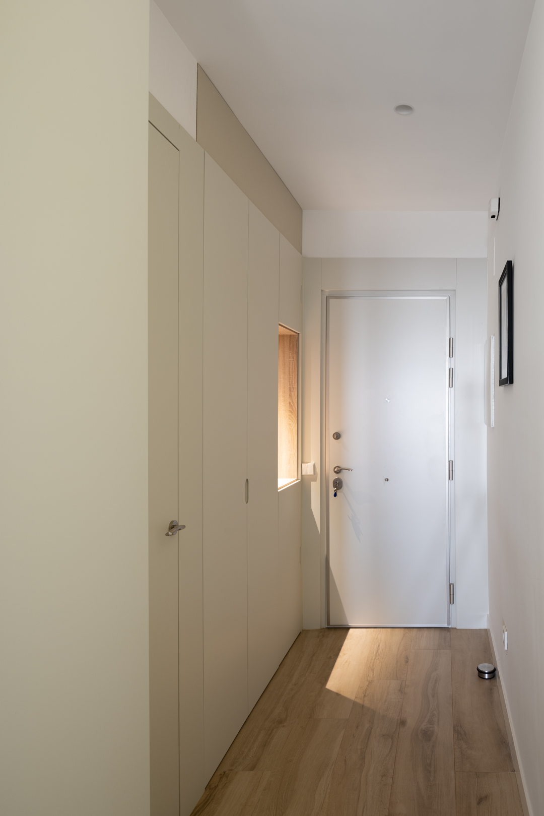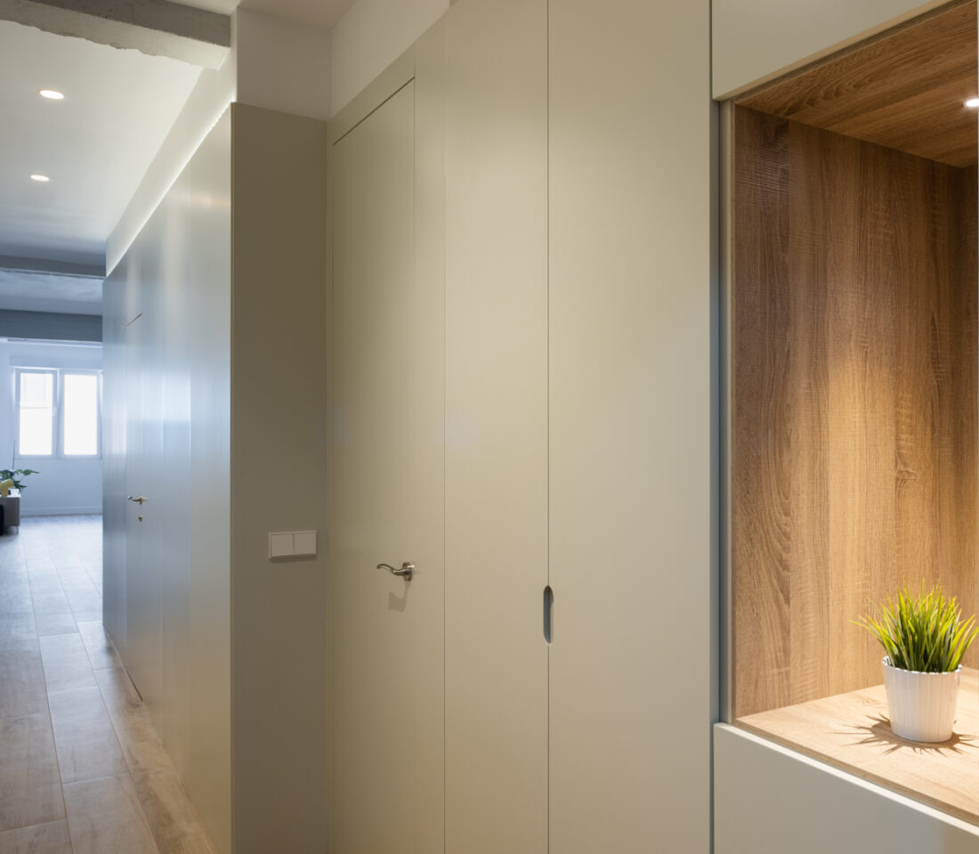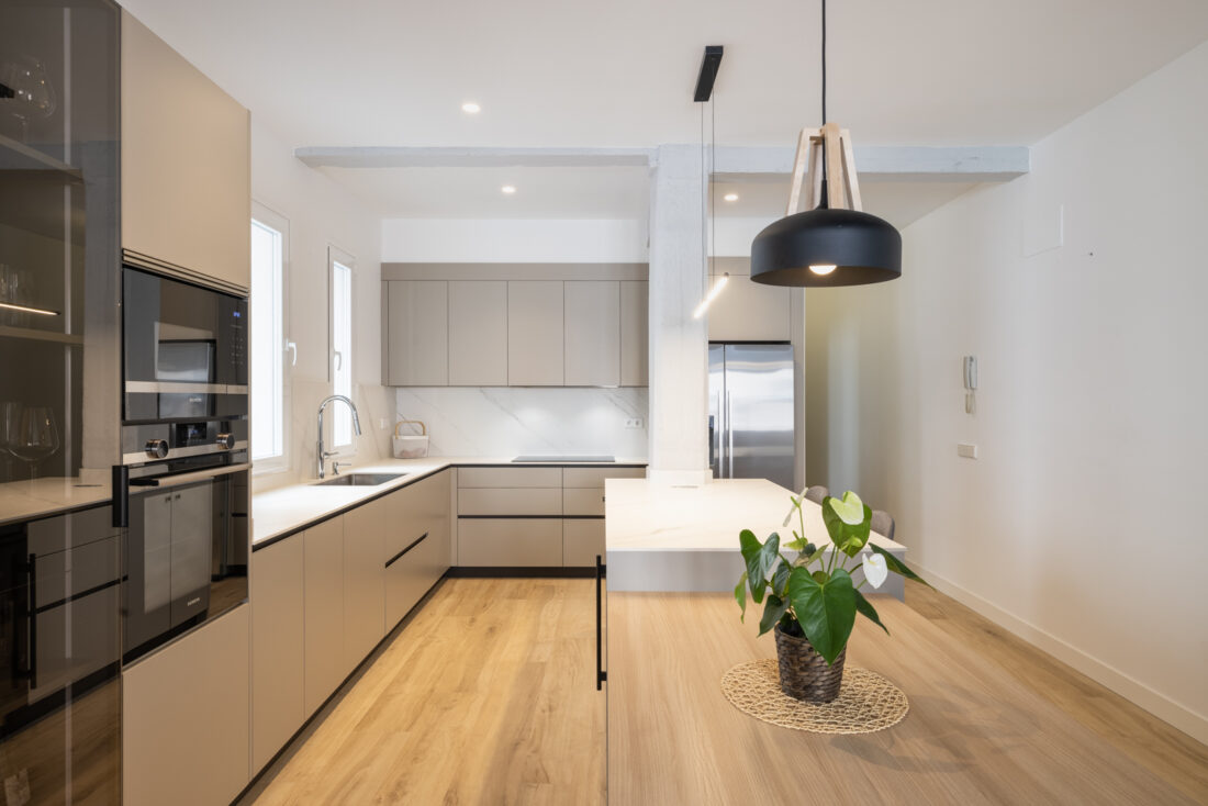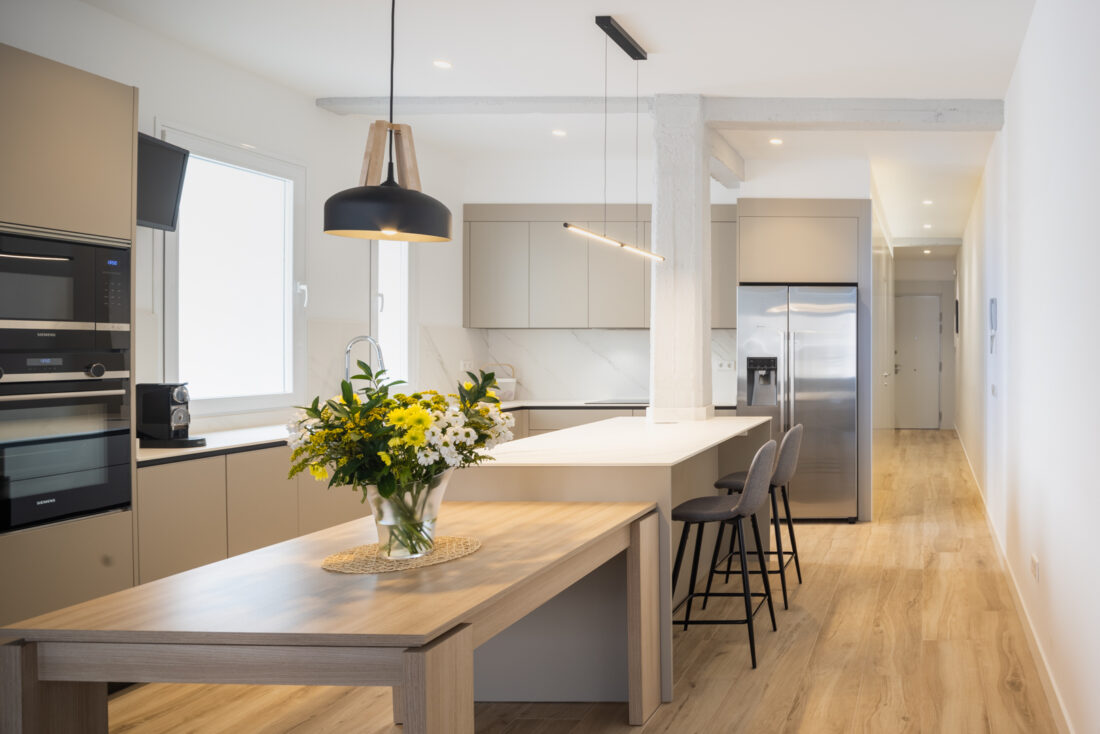 Proyecto de reforma de apartamento en Retiro. La cocina como elemento central del proyecto articula los espacios de la vivienda. El panelado gris de los muebles se extiende por las paredes del pasillo generando continuidad mientras que los espacios de salón y despacho se pueden unir a través de unas puertas correderas.