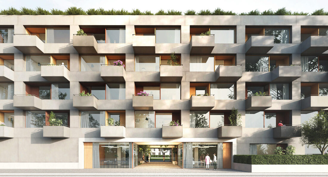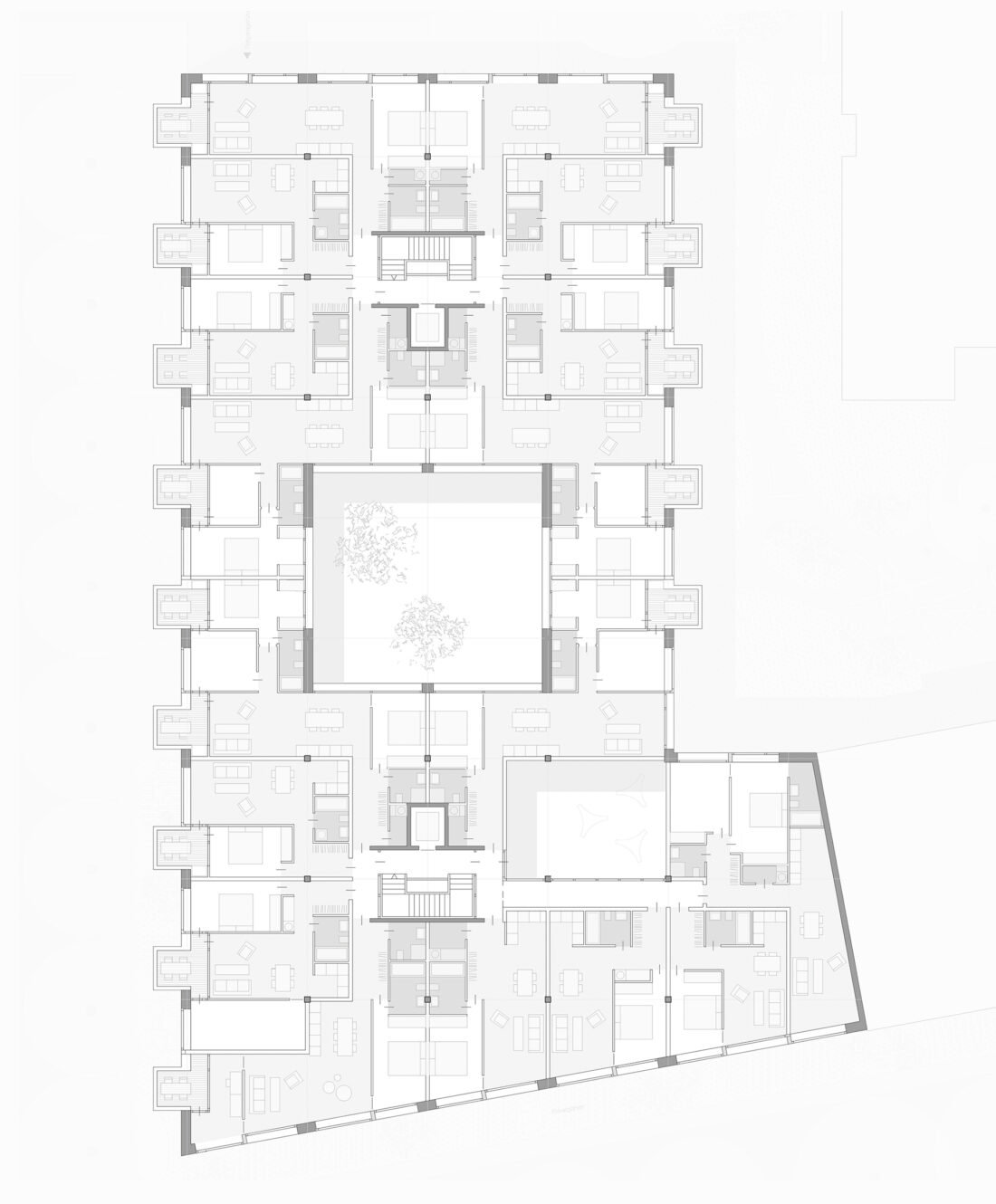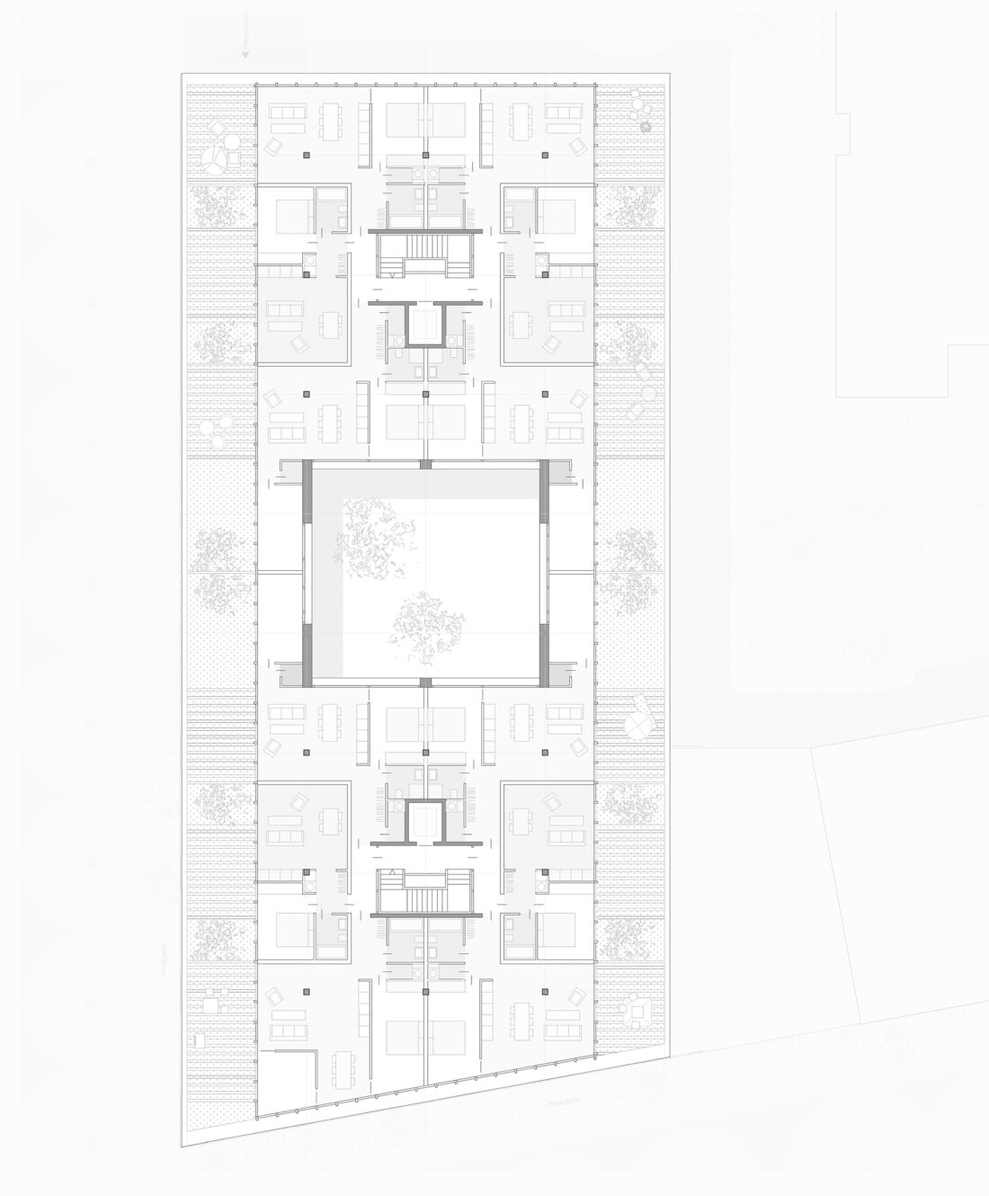 Se resuelve el programa requerido organizando todas las viviendas con solo 2 núcleos de comunicación, lo que permite maximizar la superficie útil y se crea un patio central comunicando ambos bloques para potenciar la doble orientación y ventilación cruzada en el mayor número de viviendas. En la planta baja se crea un paso conectando la calle y el patio de manzana en el que se organizan usos como tiendas, coworking o una galería de arte convirtiendo el patio en la zona pública de conexión. La fachada evoca la colocación de containers como referencia al puerto cercano.