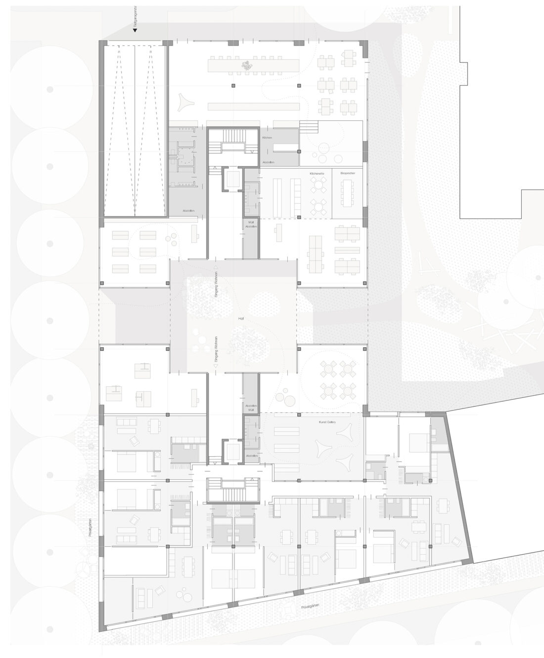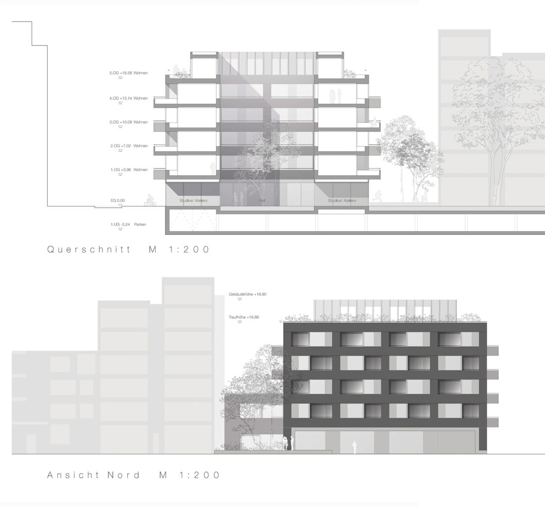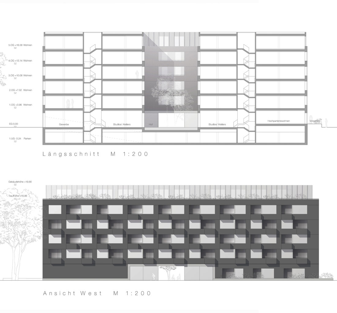 Se resuelve el programa requerido organizando todas las viviendas con solo 2 núcleos de comunicación, lo que permite maximizar la superficie útil y se crea un patio central comunicando ambos bloques para potenciar la doble orientación y ventilación cruzada en el mayor número de viviendas. En la planta baja se crea un paso conectando la calle y el patio de manzana en el que se organizan usos como tiendas, coworking o una galería de arte convirtiendo el patio en la zona pública de conexión. La fachada evoca la colocación de containers como referencia al puerto cercano.