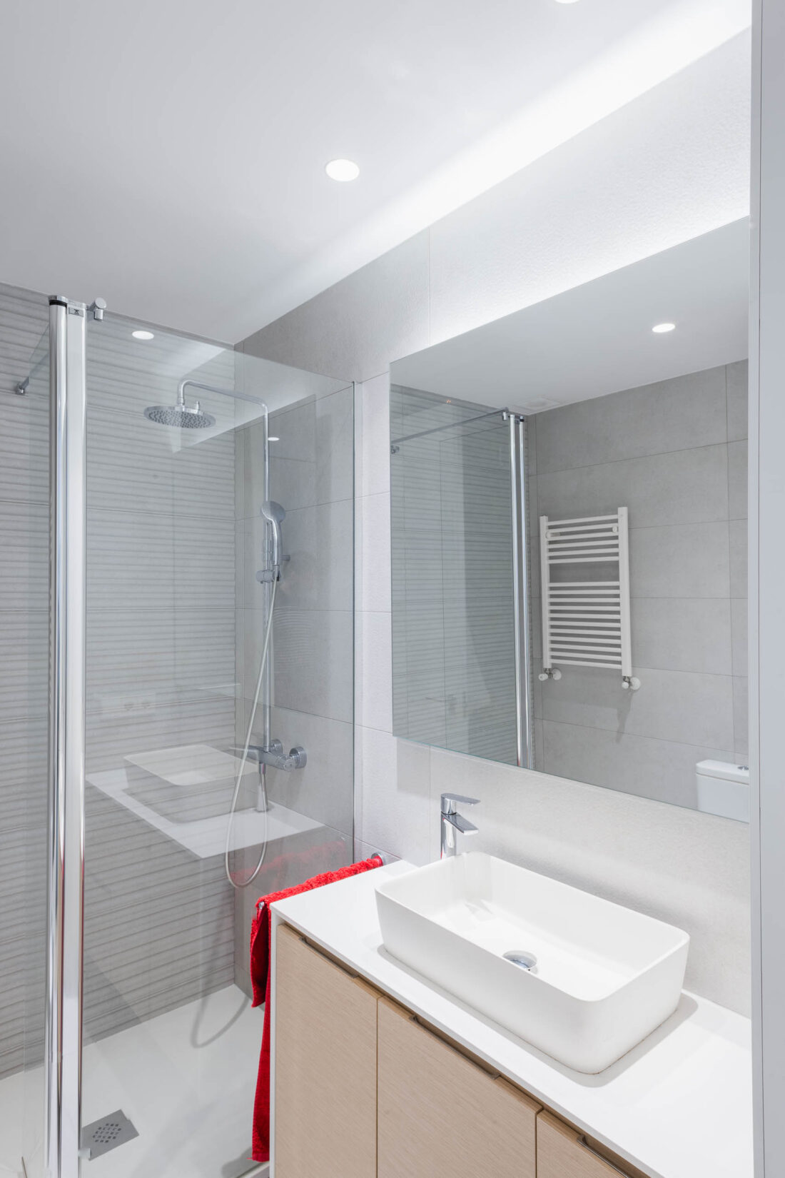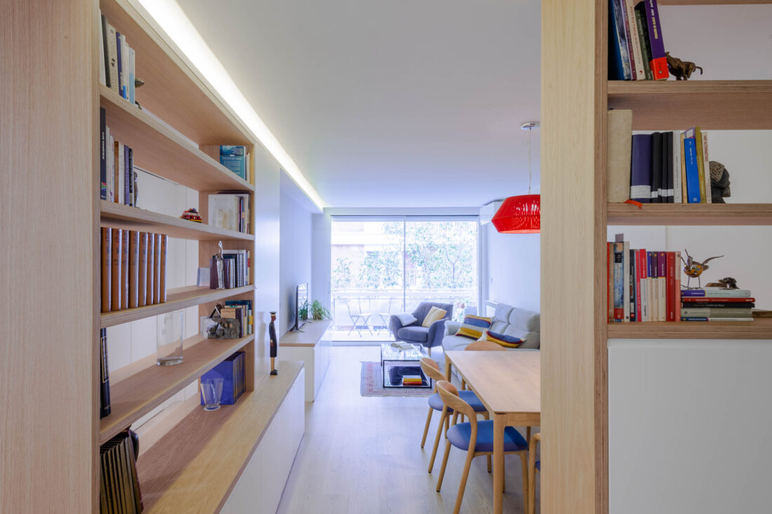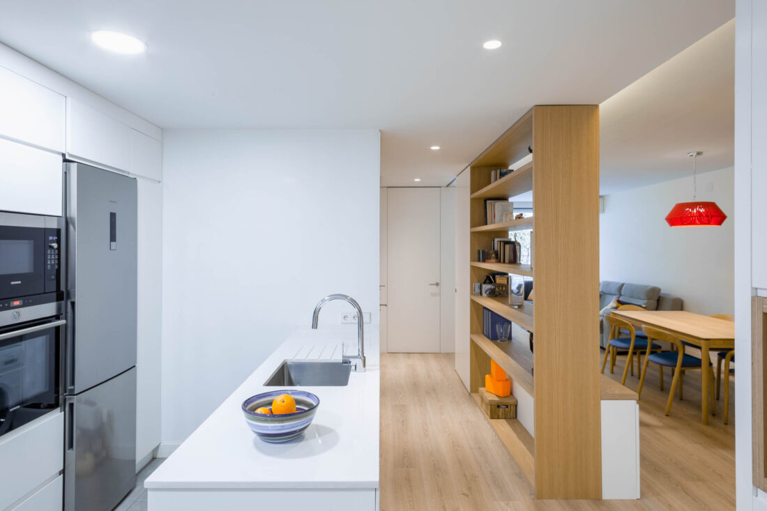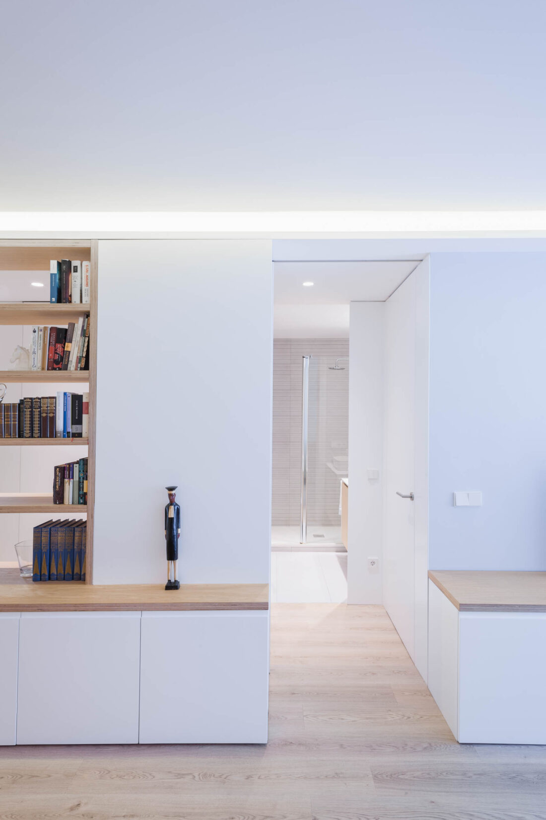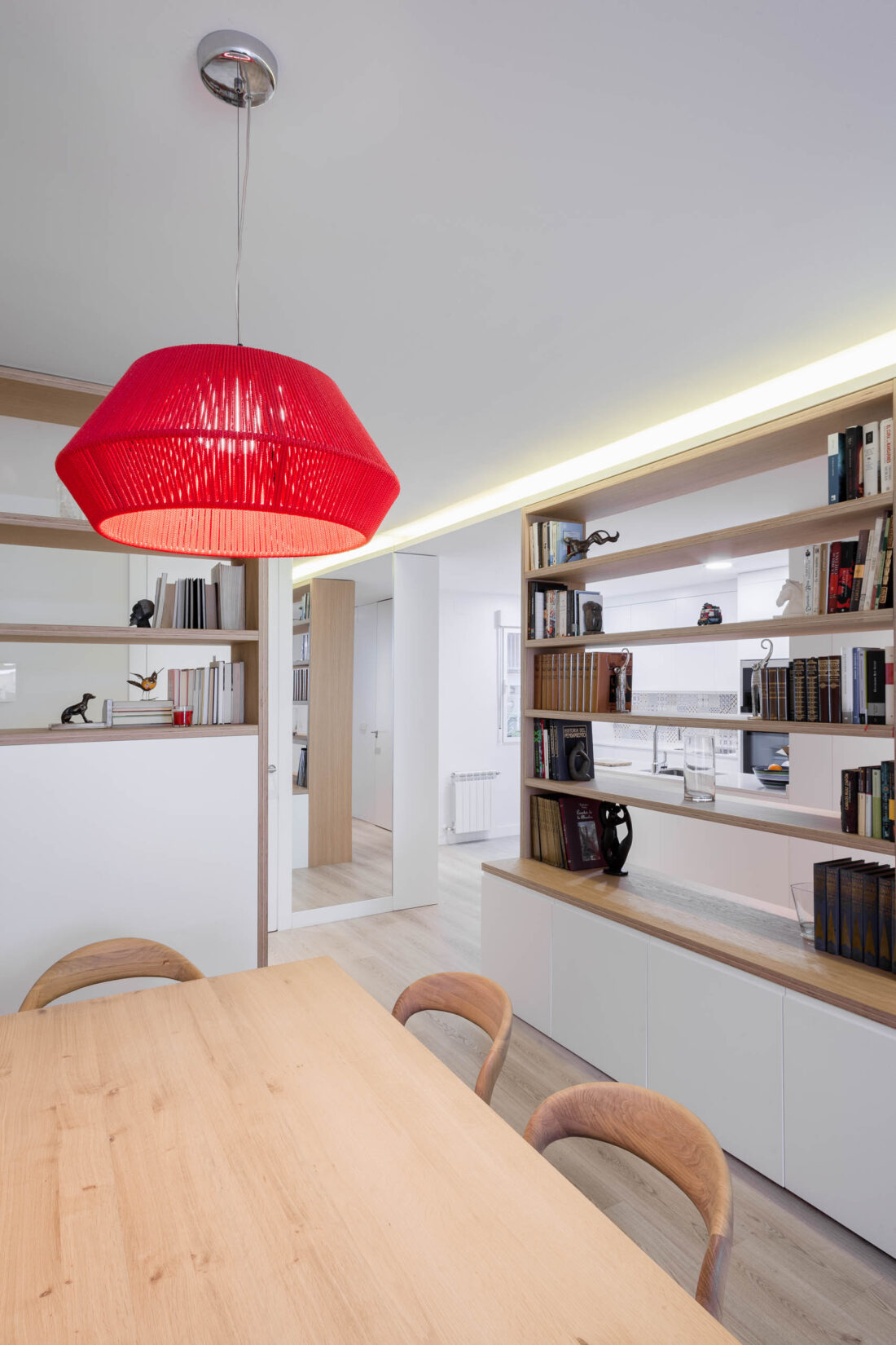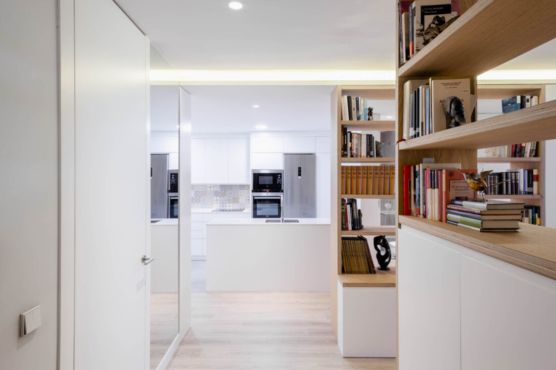 El proyecto busca la fluidez a partir de un gran espacio común dividido con piezas de mobiliario que una separación de espacios sin interrumpir la visual de una punta a otra de la casa. Además, se potencia esa conexión visual, en este caso con el exterior, con un gran ventanal Una línea, marcada en el techo con una candileja y reforzada con su reflejo en un espejo por un lado y por otro por la ventana, divide la mitad mas “pública” (entrada, habitación de invitados y salón comedor) de la mas “privada” (cocina, dormitorio principal y baños). Los 4 muebles se diseñan con una base en blanco para ganar luminosidad y detalles en roble que marcan la función de cada uno:office de apoyo en la cocina, estanterías para separar la entrada y el pasillo y encimera para el mueble de la TV.