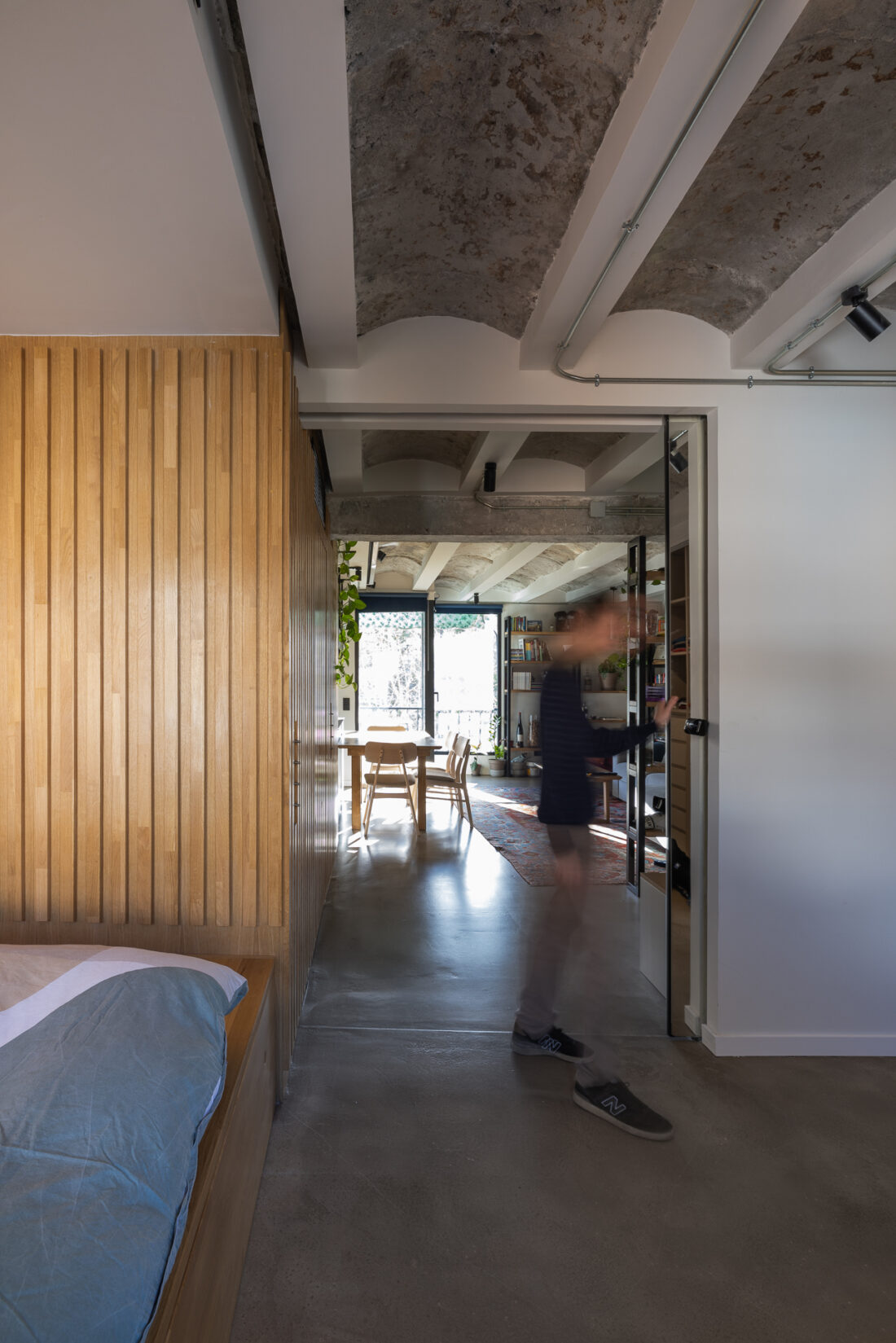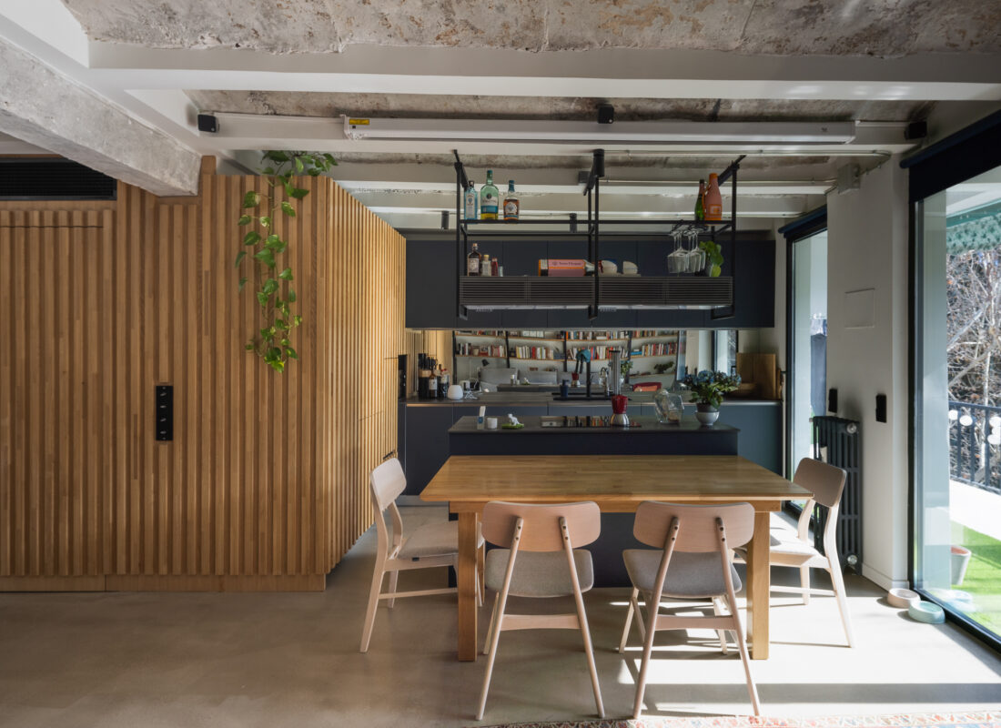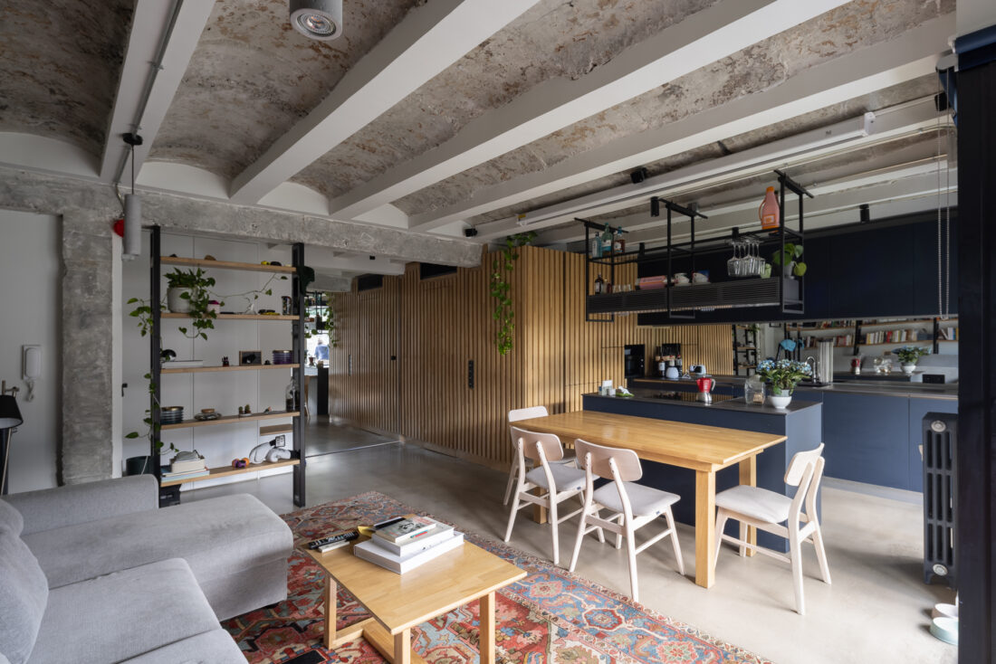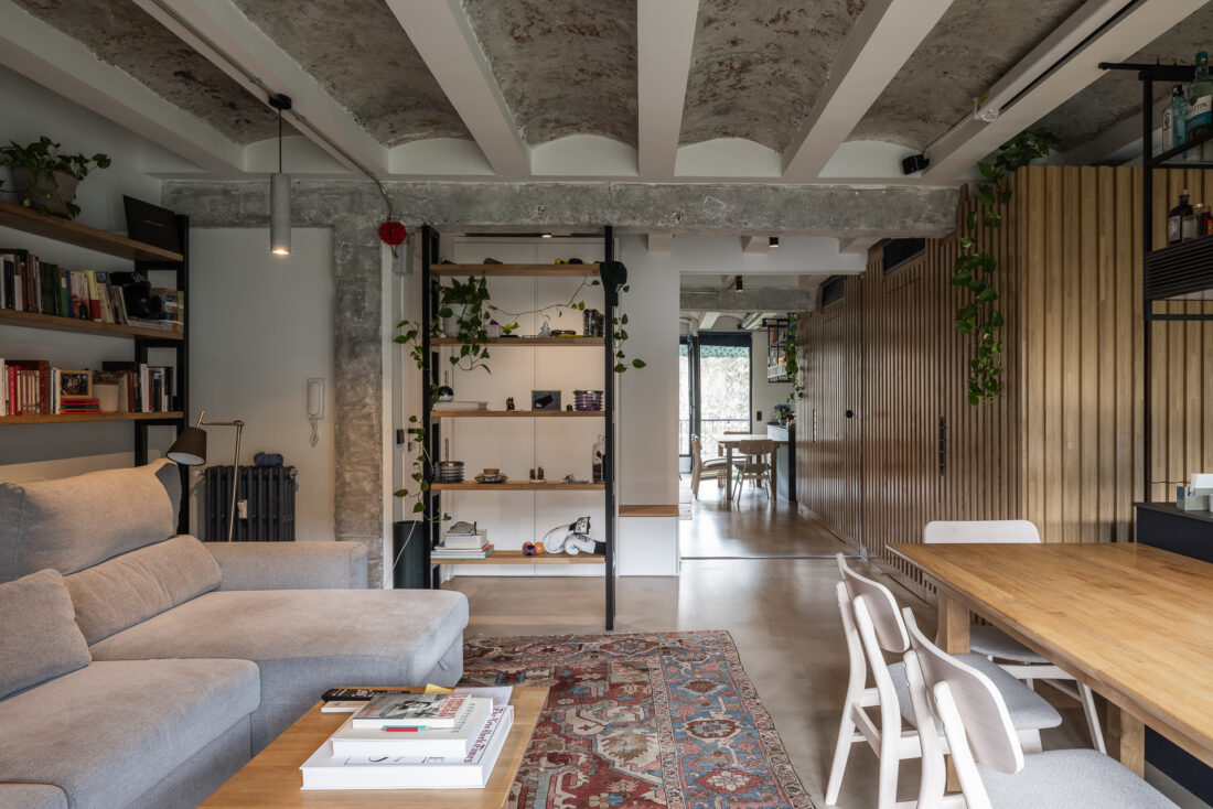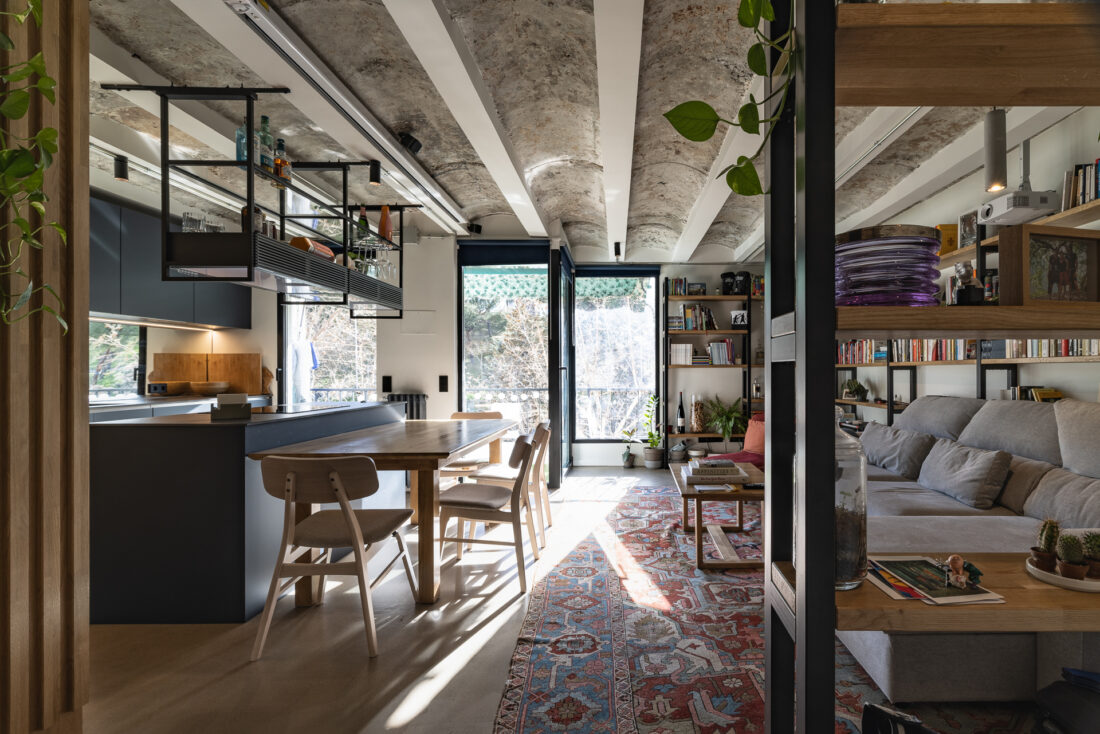 Limpiar de continente y llenar con contenido. Arquitectura en bruto que genera un espacio diáfano que las piezas de mobiliario consiguen organizar.