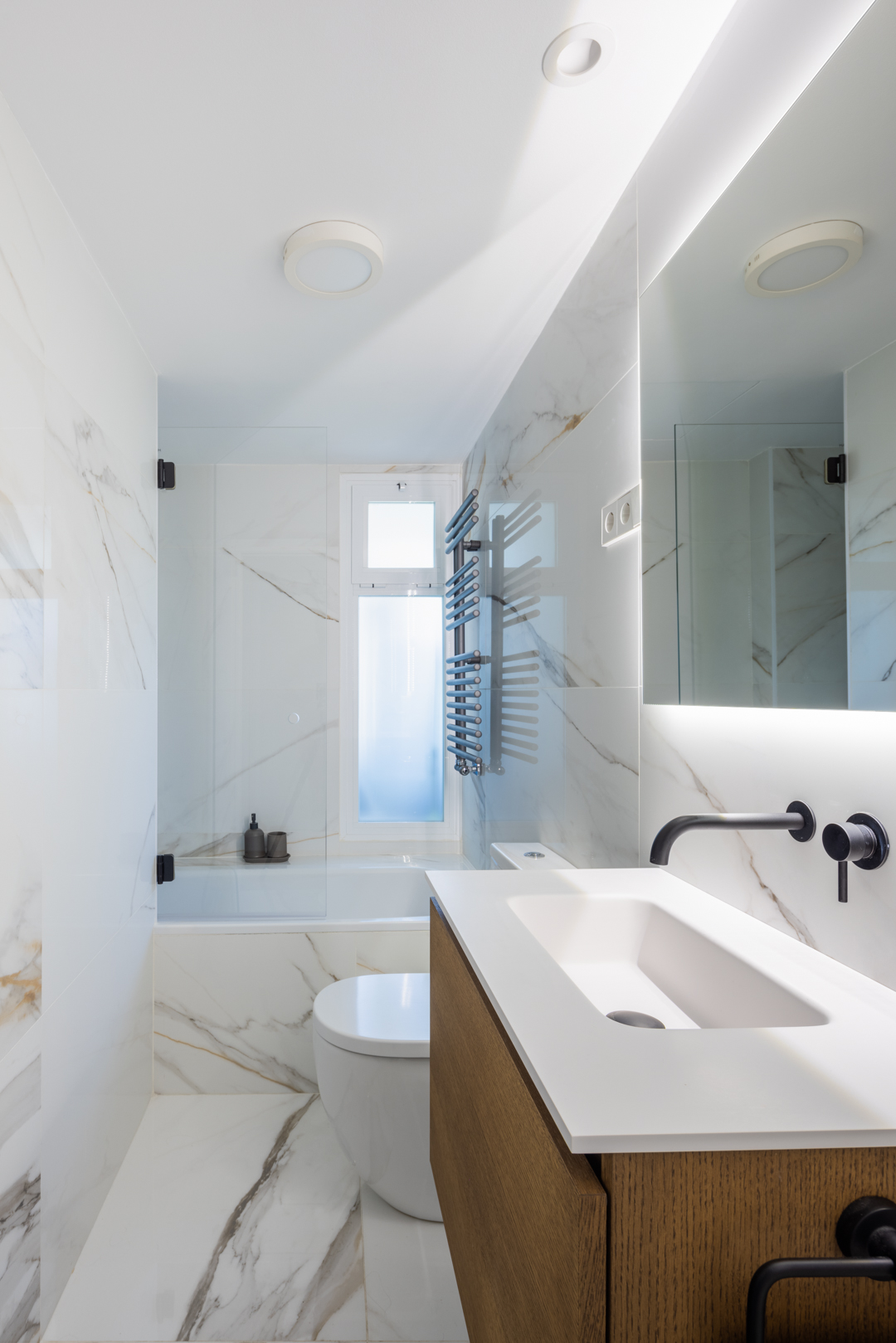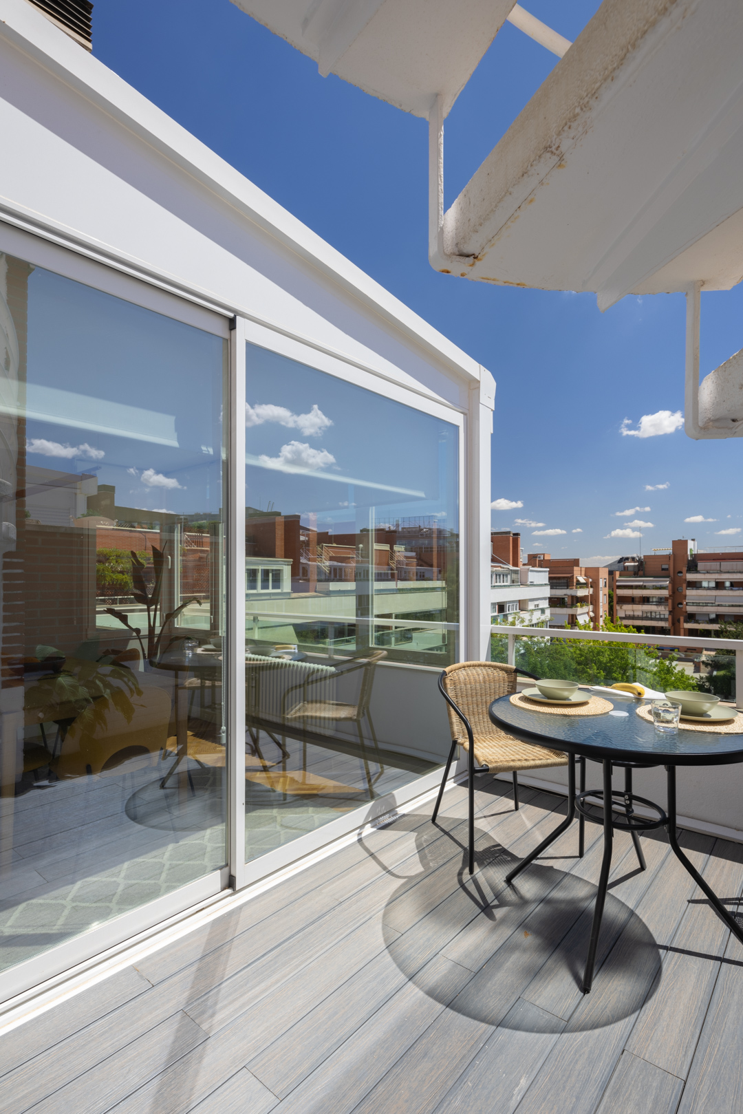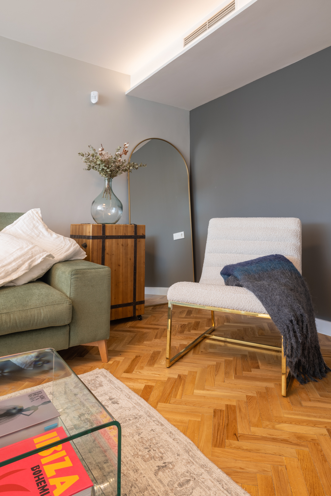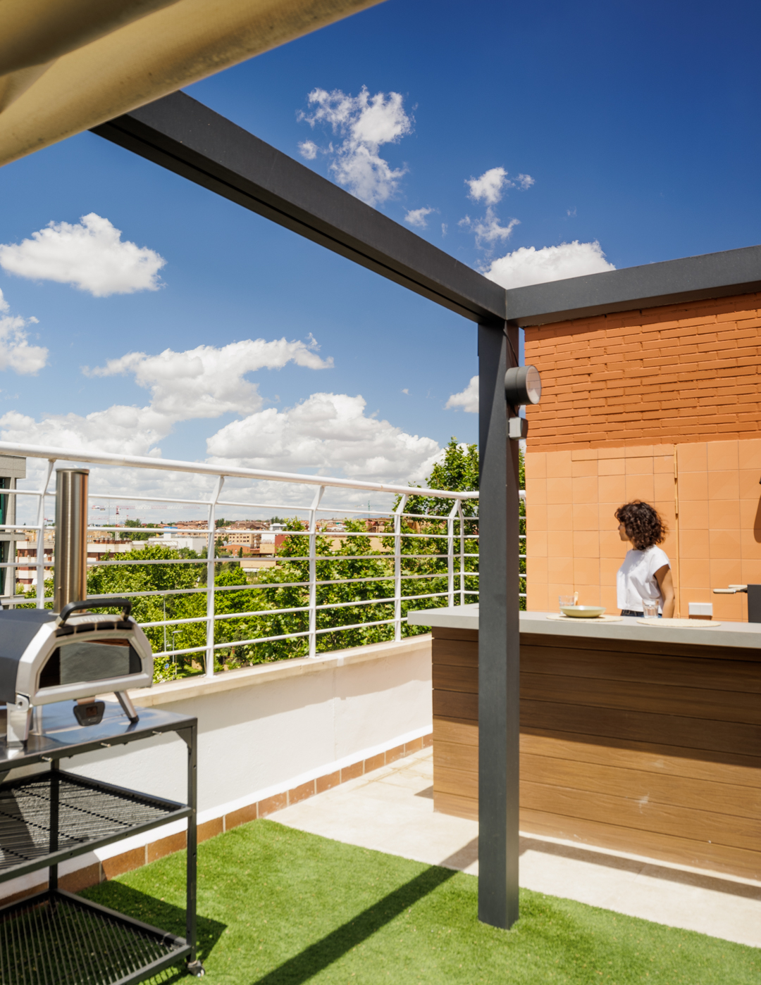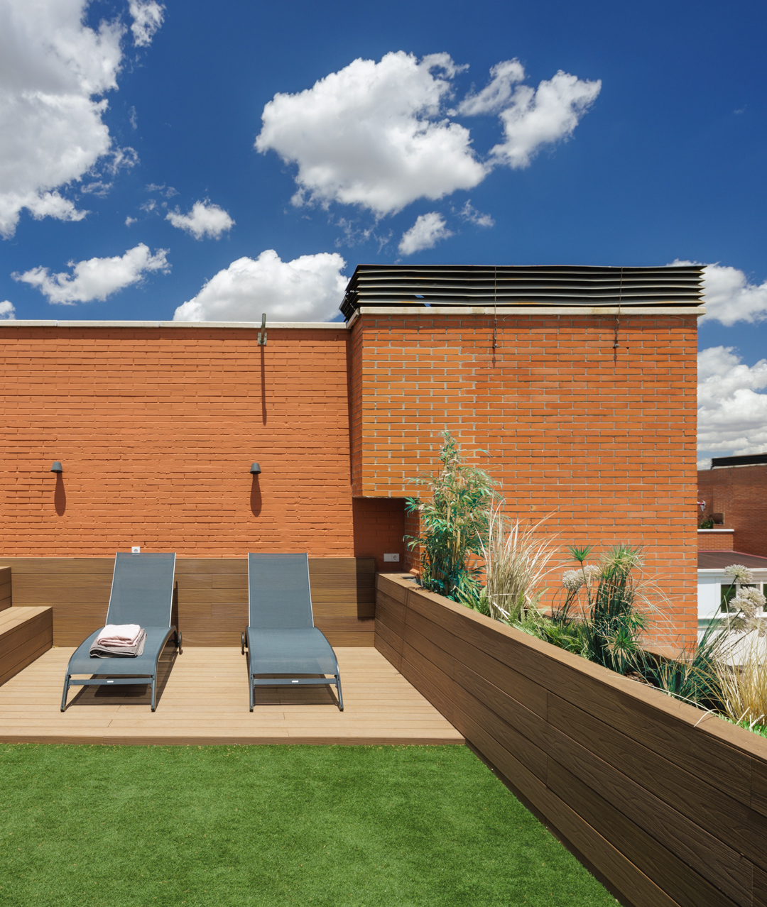 En este apartamento creamos una nueva conexión entre el salón y el dormitorio principal a través de una pequeña terraza, buscando la interacción de los espacios interiores con los exteriores. En la azotea un jardín con barbacoa y jacuzzi que invita a vivir al aire libre.
