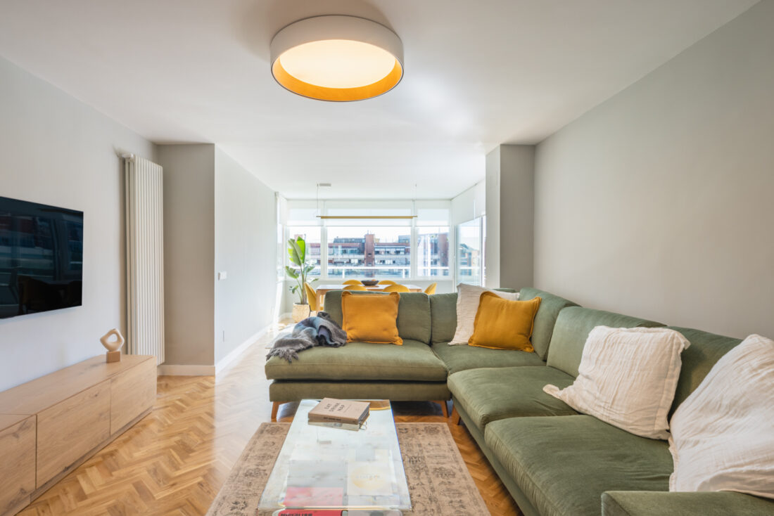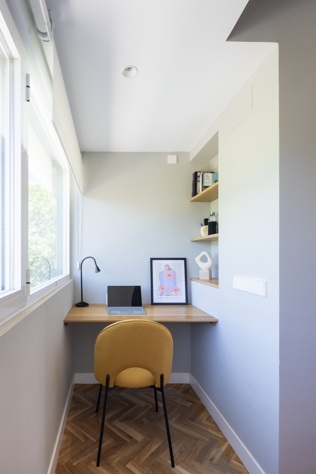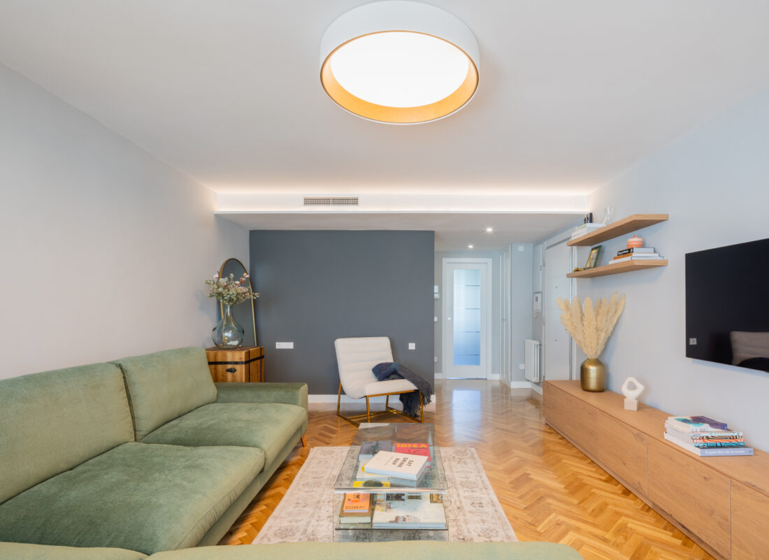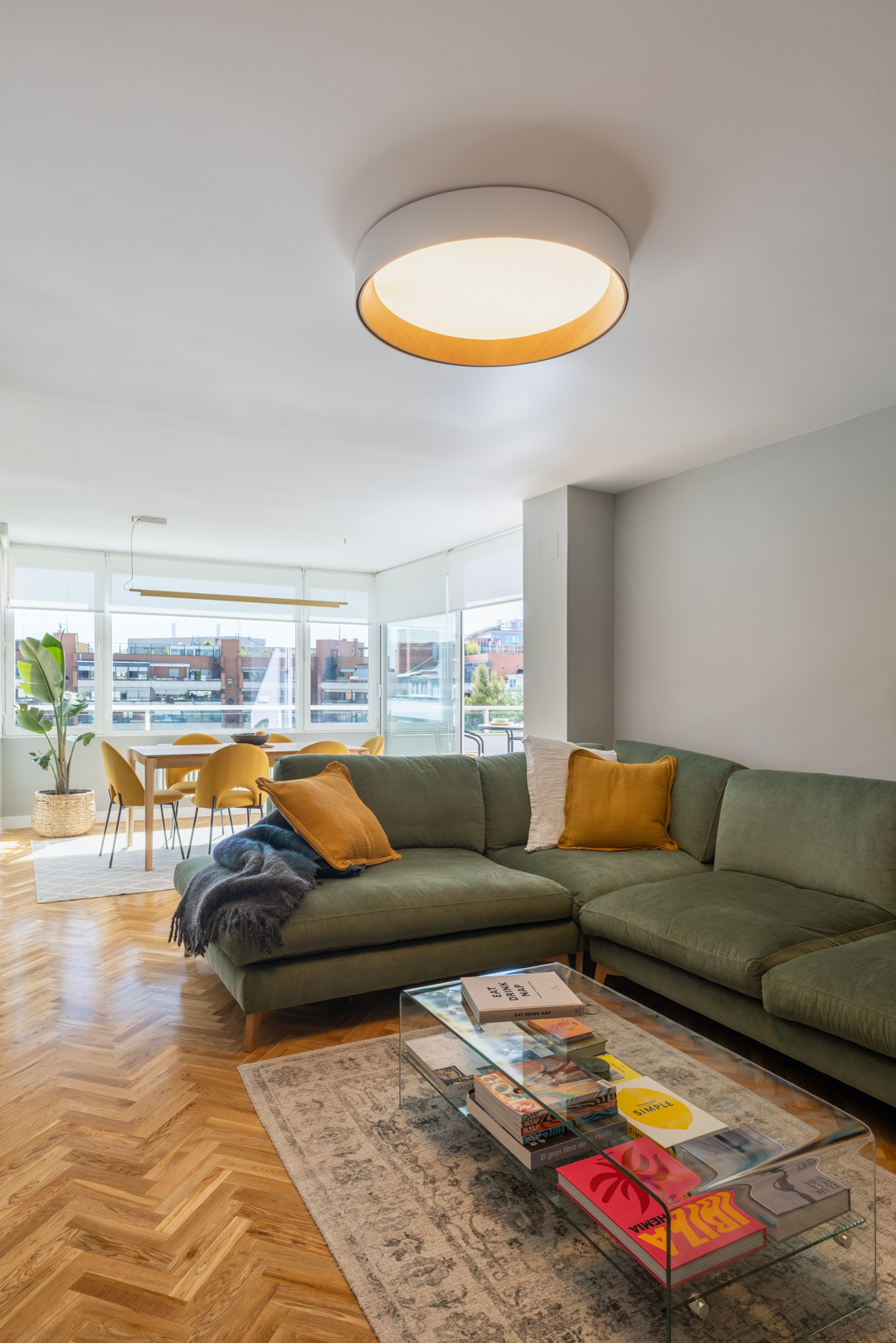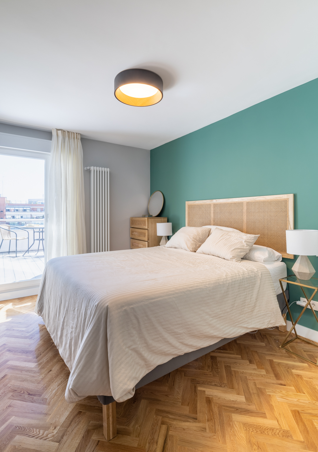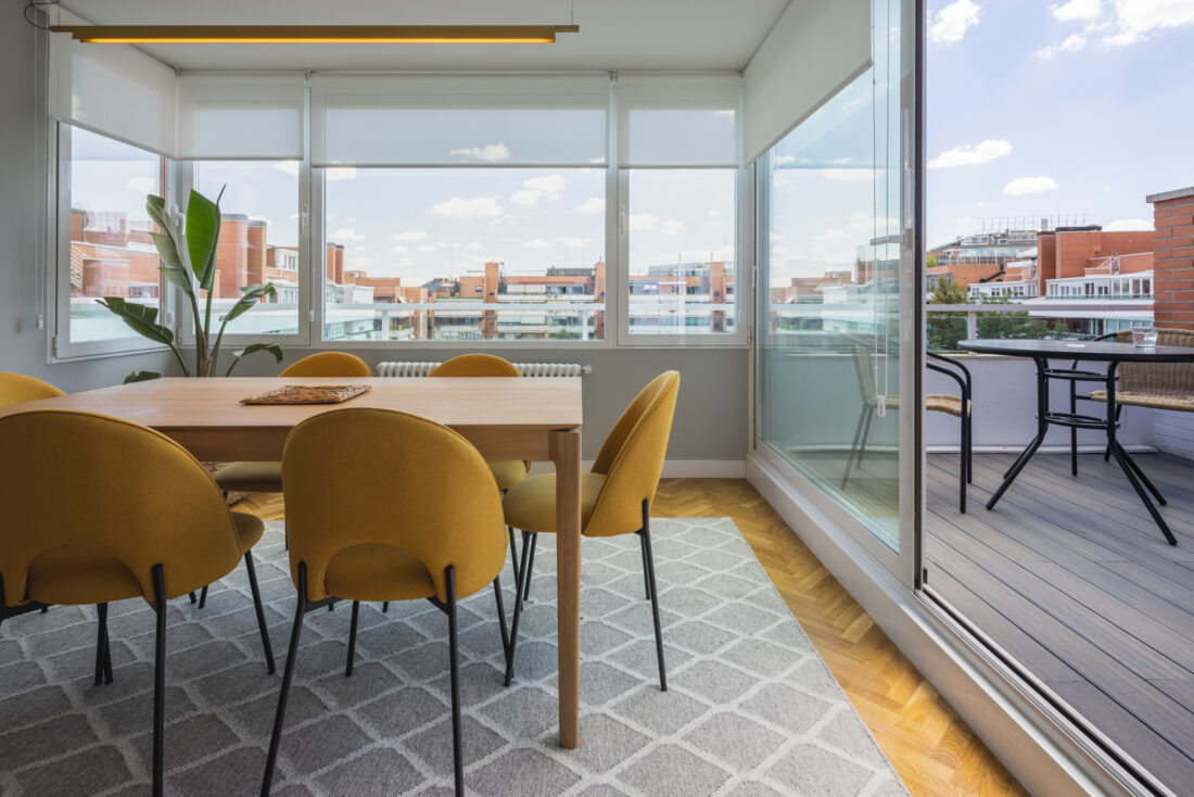 En este apartamento creamos una nueva conexión entre el salón y el dormitorio principal a través de una pequeña terraza, buscando la interacción de los espacios interiores con los exteriores. En la azotea un jardín con barbacoa y jacuzzi que invita a vivir al aire libre.